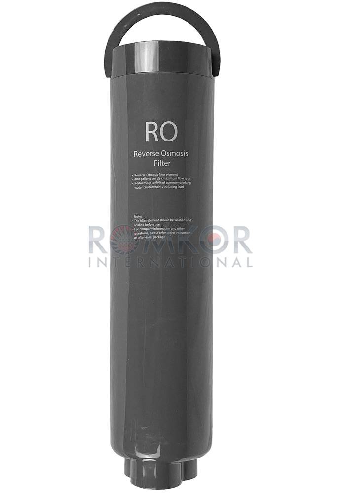 Filtrul Osmoza inversa 400 GPD este singurul filtru de osmoza cu debit foarte mare de pe piata, care asigura un flux de apa filtrata de 3030 litri / zi, respectiv 2 litri / minut, de 10 ori mai mare fata de osmozele conventionale care sunt de 284 litri / zi, respectiv 0,2 litri / minut. Cu ajutorul pompei din dotare apa filtrata este livrata cu o presiune superioara, similara ultrafiltrarii. Principiul acestui filtru consta in trecera apei printr-o membrana semipermeabila cu diametrele orificiilor de numai 0,0001 mironi prin procedeul numit osomoza inversa. Se blocheaza astfel trecerea nu numai a majoritatii compusilor chimici organici si anorganici daunatori (saruri,oxizi, metale si nemetale, grasimi, produse derivate petroliere, pesticide, etc.), ci si a impuritatilor biologice de tipul chisturilor (lambii), bacteriilor si virusurilor care aduc riscuri mari de imbolnavire (dimensiunile bacteriilor sunt de cativa microni, iar dimnesiunile virusurilor au intre 0,01 si 0,4 microni).